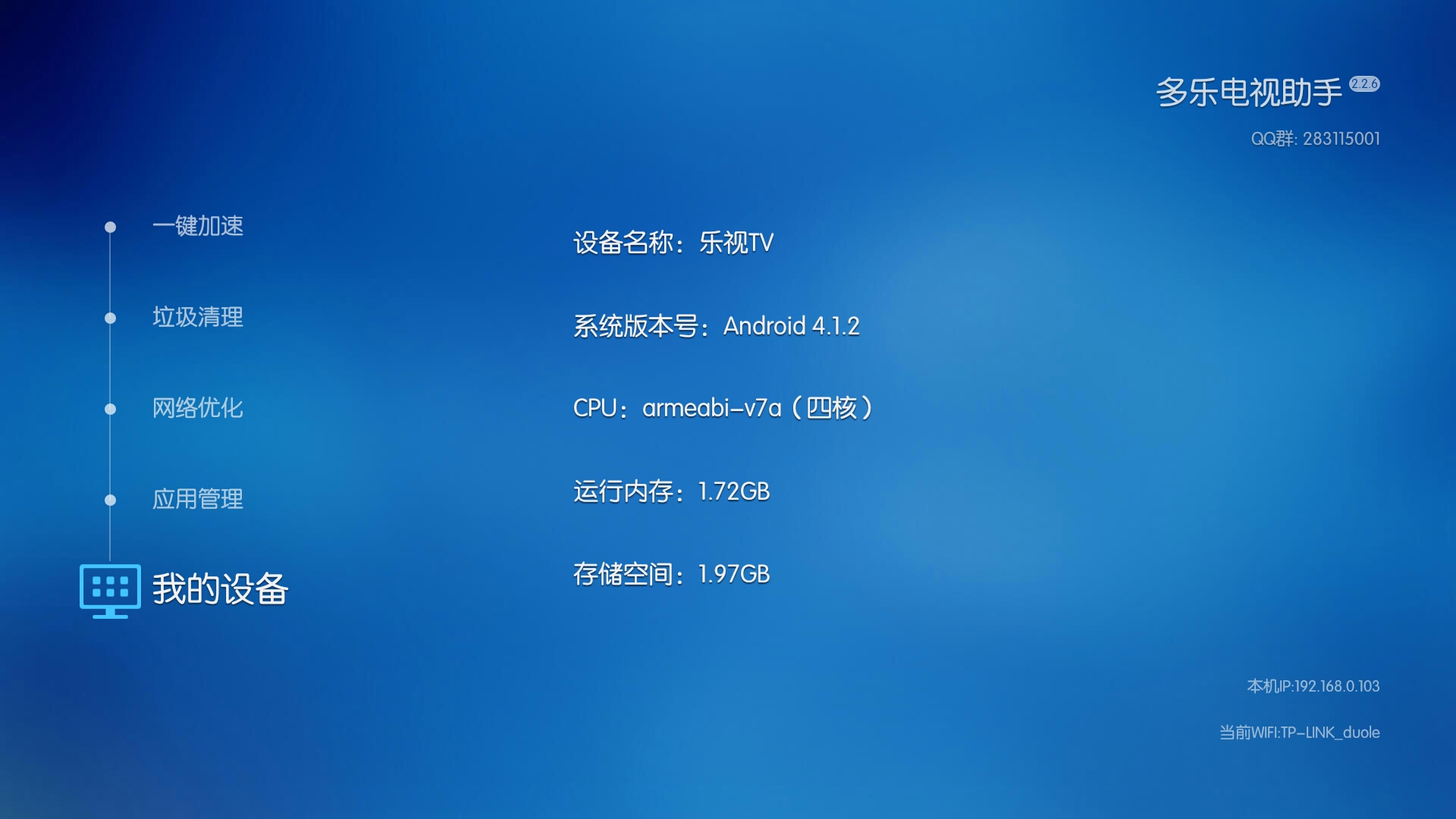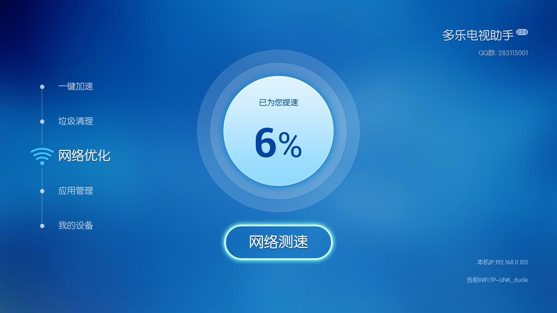 多乐电视助手是一款专为Android系统智能电视及电视盒子设计的优化管理工具。它提供电视加速、垃圾清理、应用卸载、网络测速和加速等功能,让您快速对电视及盒子进行深度清理和优化,实时监测和加速网络速度,为您带来最佳的大屏娱乐体验!