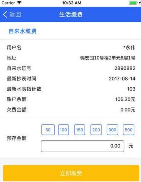 2. 然后选择需要付款的项目,您将能够查看使用情况,并可预存金额,直接点击“立即缴费”即可。