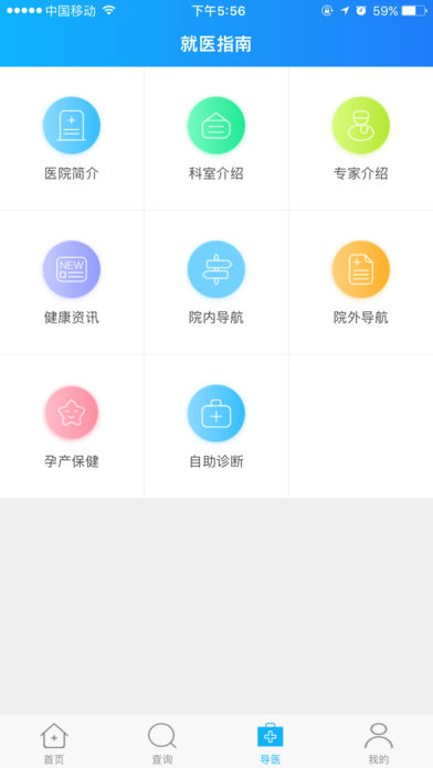 导医服务:医院简介、科室介绍、专家介绍、健康资讯、院内导航、院外导航、孕产保健及自助诊断;