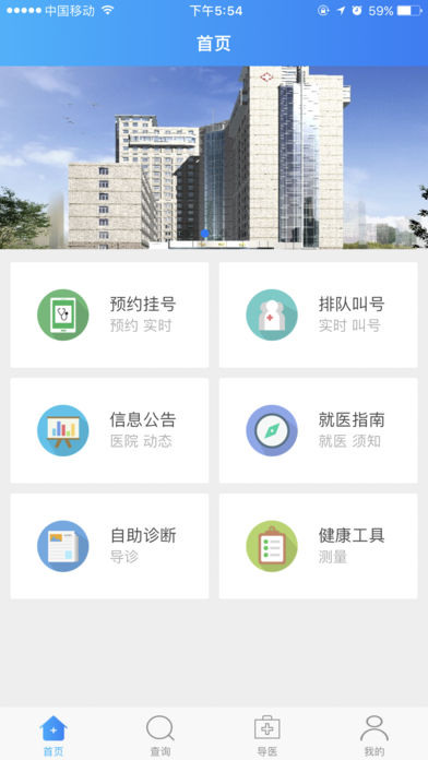 主页功能:预约挂号、信息公告、就医指南、自助诊断及健康工具;
