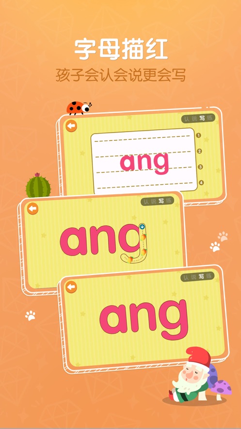 涵盖63个拼音、126+拼读训练、63对词语卡片、30+互动游戏,从认、说、写、练四大维度,全方位认知拼音字母的知识!
