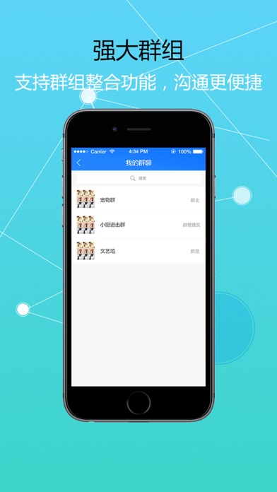 群组:无论是大型企业的通用群组、售后服务群,还是管理、培训课程等,都能满足大型群体的需求,轻松合并或拆分群组,便于管理与交流。