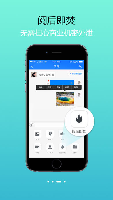 阅后即焚:机密聊天内容不可复制、不可截图,好友阅读后自动删除,无需担心信息泄露,可尽情进行安全的私密交流。