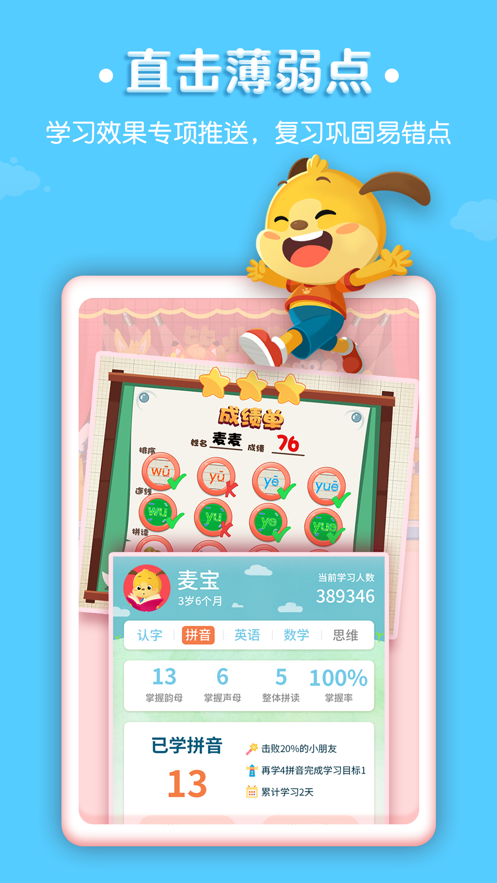 《麦田拼音》APP的内容涵盖23个声母、24个韵母、16个整体认读音节、126个学习场景、480个汉字拼音以及18个单元小测。从“听”到“说”,“读”再到“写”,全方位训练孩子在拼音认知、记忆、发音、拼读、书写及应用等方面的能力。