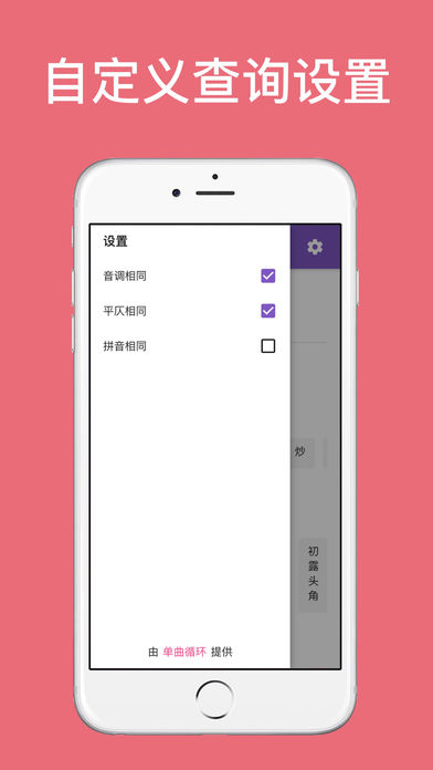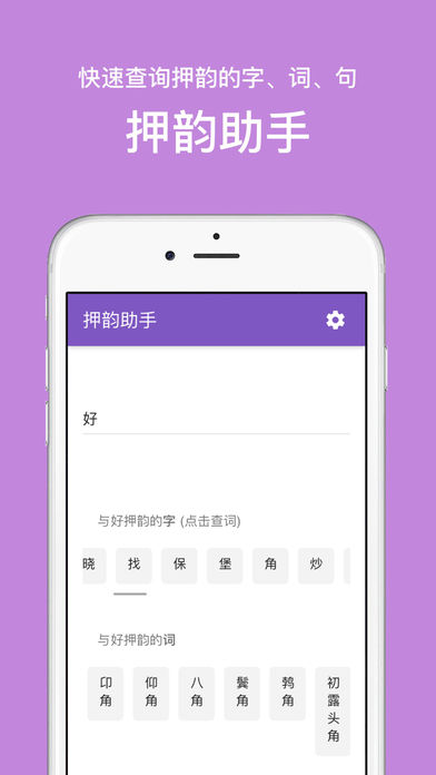 押韵助手app作为一款韵文词典,致力于为您查找韵母相同或相近的字词,助力于诗歌、词牌、对联、歌词、文案等各类文学创作的词句运用。