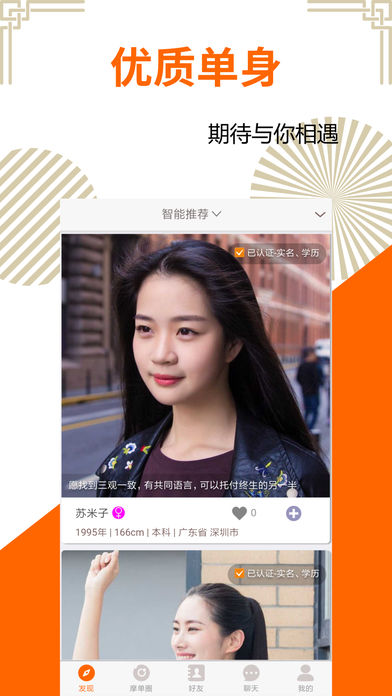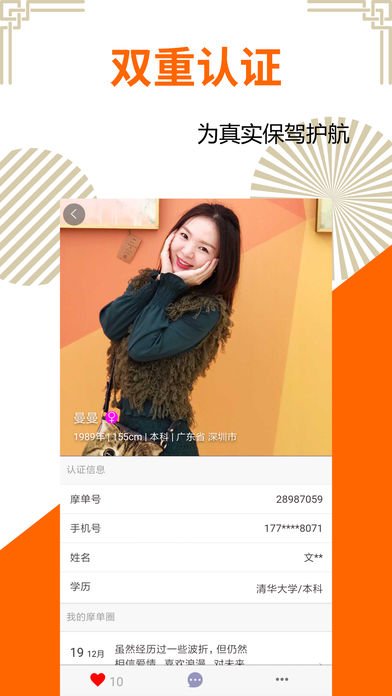 1、实名认证:实名身份认证,确保真人、真照、真资料,严肃对待交友,拒绝一切欺骗。