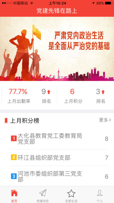 1. 首页宣传页面:动态展示支部的出勤率及积分排名、推荐的优秀心得及幻灯片等;