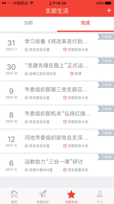 新建会议或活动:在APP首页底部菜单找到“支部生活”并点击进入→在右上角找到“+”按钮,点击后选择新建会议或活动→完善会议的“主题”、“地点”、“时间”、“类型”→会议内容完善后,可选择“保存”或直接“发布”(保存后会议将在“新建”会议列表中显示,发布后将进入“当前”会议列表,发布后才能使用);