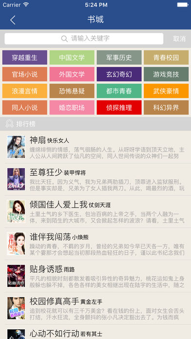 小说书城,汇聚在线阅读、智能搜索、阅读设置、亮度自动调节等多项人性化功能。分类丰富,、言情、灵异、奇幻、、仙侠、历史军事、穿越等各类小说应有尽有。作为一款免费的追书工具,致力于将最新、最火、最全的网络小说一网打尽,海量书籍任你挑选,涵盖各大网站的热门连载小说,提供最及时的连载更新提示,亦可缓存后,是小说阅读的必备应用。