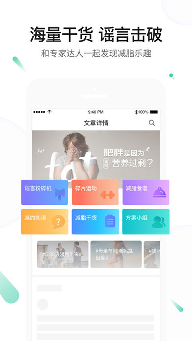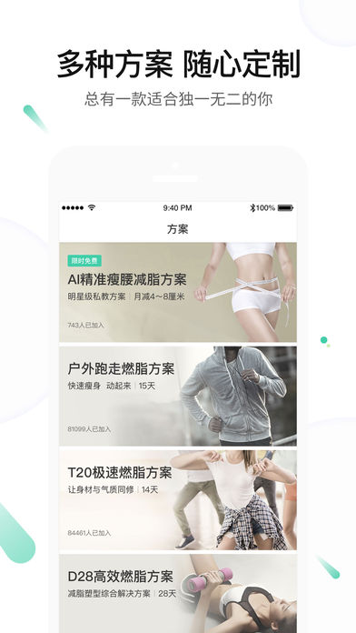为腰腹部肥胖的用户,减约APP专心研发了AI瘦腰减肥减脂方案,这是首套运用人工智能技术的减脂方案,能够为用户提供精准的配餐和运动计划。对热爱运动的用户,提供了户外跑步燃脂方案、D28高效燃脂方案及T20极速燃脂方案,搭配推荐的饮食,实现健康减脂;同时,贴心的减约也为“运动恐惧者”量身定制了小轻轻-轻食方案,无需运动也能轻松瘦身~