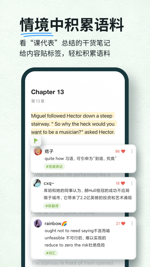 1. 阅读过程中的每一个生词均可即时添加至个人学习计划,借助扇贝强大的记忆系统进行学习。