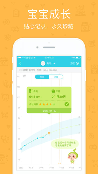 2、科学统计:清晰的曲线与图表展示宝宝成长发育各项指标的变化,帮助树立良好的健康习惯