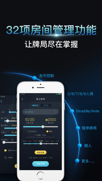 便利迅捷的约局工具,提升德州扑克技巧,拥有32项房间管理功能与10项个性化设置,丰富的比赛体验,安全、公平、专业的德州扑克社交平台,重现德州扑克的竞技乐趣!