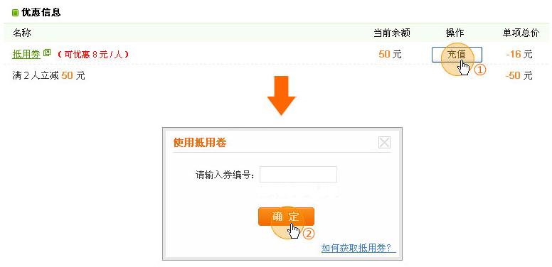 b) 预订旅游产品并填写订单时,在填写订单页面,点击优惠信息中的抵用券栏“充值”按钮(①),输入抵用券编号,并确认充值(②),如图2所示。系统将自动计算相应优惠,余额将存入您的抵用券账户,以备下次使用。