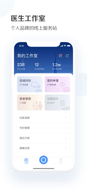 抖医APP,医生的线上工作室,个人品牌的服务平台;在抖医中,分享珍贵的健康小知识;在线咨询,利用碎片化时间为患者解答疑惑;二维码名片,助力线上线下推广个人品牌。