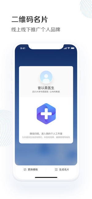 下拉快速展示二维码名片,患者可通过微信扫码轻松进入医生工作室,也可生成名片海报,精准触达更多患者。更多