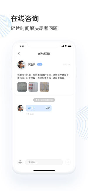 服务时间灵活掌控,支持文字与语音回复患者,沟通高效,问诊记录永久保存,助力积累移动患者病例库。