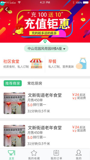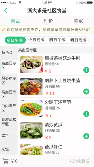 营养套餐模块:依照菜品的特性及营养价值进行专业分类,供用户随心选择,并支持今日及明日的餐饮预定。用户可随时在手机APP中的社区食堂点餐,养你一辈子将安排专业外送人员,在用户指定的时刻,将美味送至指定地址,解决老年人在用餐方面的困扰与难题。