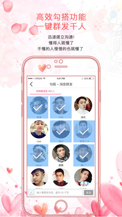 4、高效沟通功能,一键群发千人。