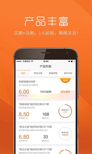 活期产品“余额猫”随存随取,灵活便捷;定期产品“银企众盈”投资周期一般为1-3个月,流动性强。