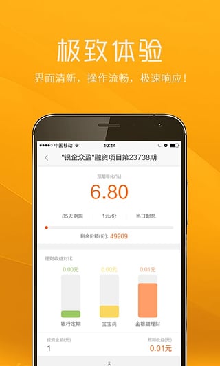 金银猫App,由国内专业互联网票据理财平台金银猫推出的移动应用,致力于为千万稳健理财投资者提供更安全、专业、灵活、便捷的在线理财服务,助力投资者财富安全增值。这款实用简便、管理便捷、体验流畅的投资理财神器!在金银猫App上进行理财投资,用户可享受四大明显投资优势:高安全性,在金银猫App平台主要质押物为银行承兑汇票,到期由银行无条件兑付,风险微乎其微。在金银猫App上,投资者资金账户与公司自有账户分开运行,投资者资金全部存放于银行专管账户,资金流动受银行监控,确保投资者资金安全;其次是低门槛,投资周期短,最低1元起投,让投资理财不再是富人的专属游戏;第三是超灵活,活期项目随存随取,无封闭期。例如,金银猫App推出的“余额猫滴807期”,年利率高达7%,且由承兑汇票抵押,最低100元起购,灵活取取,投资自由自在,宛如银行活期账户存款,却享受比定期存款更高的收益;第四是稳健收益,平台产品收益稳定,风险低,助您增值。