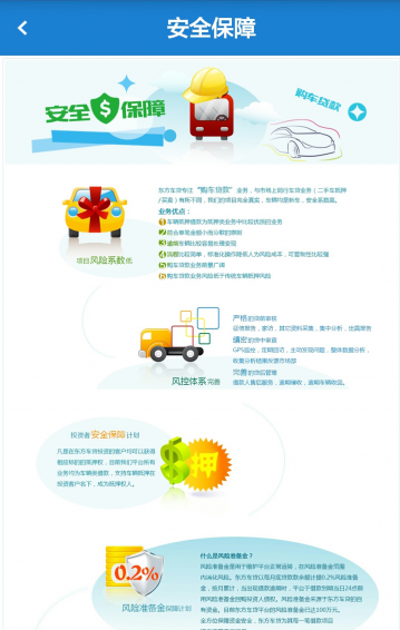 “就资产风险而言,车贷业务风险普遍低于小额信贷或其他大额借贷业务;就车贷本身而言,与小额信贷相比,车贷产品的金融需求更加广泛,车贷平台也更易于挖掘和维护优质客户。”东方车贷网管理者表示。在风控和安全保障措施方面,东方车贷建立了严格的贷前审查、周密的贷中审查和完善的贷后管理,通过征信收集、定期回访、数据分析、逾期催收等一系列环节确保平台具备完善的风控体系。此外,东方车贷还为投资者提供安全保障计划、风险准备金计划和阿里云数据备份,不仅保障了广大投资群体的利益,也进一步提升了平台的安全性。