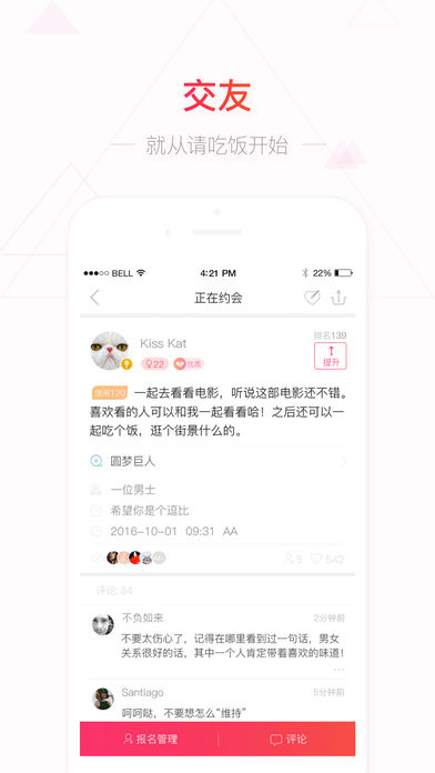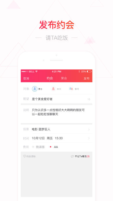 邀您共进晚餐,是一款专为苹果手机用户打造的同城陌生人交友约会软件。在这里,您可以轻松告别孤独,找到属于自己的幸福。我们根据兴趣爱好、个性特征、同城等多维度精确匹配,帮助您快速找到心仪的对象。