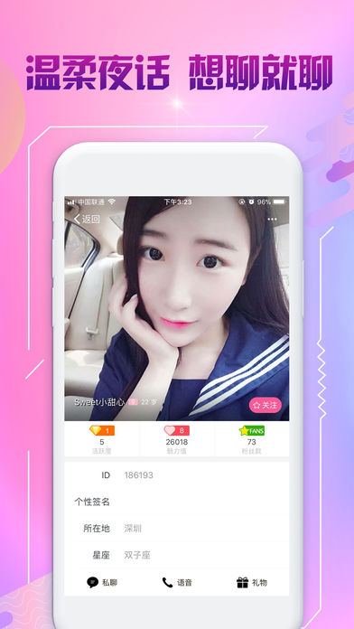 夜聊甜心app苹果版是一款极受欢迎的聊天交友应用,汇聚了优质的用户资源,所提供的信息真实可靠,能够迅速根据您的需求进行匹配聊天。诚邀各位感兴趣的朋友下载体验这款软件。