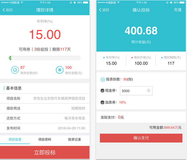 我们独创了行业领先的借贷信息匹配系统,无需等待满标,按天计算,即投即计息。