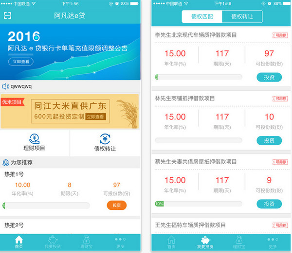 阿凡达e贷app是一款融合互联网金融的服务的手机应用,其集投资理财与中小微企业(个人)借贷于一体,为客户提供更为便捷的投融资渠道,成为您“触手可及”的掌上金融服务平台。