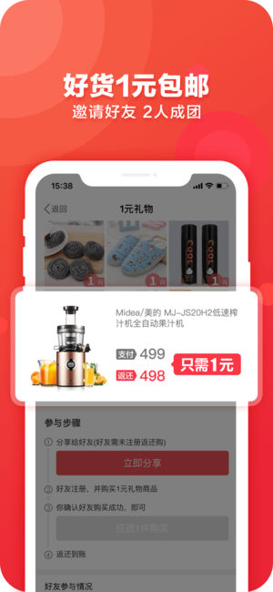 返还购采用返利模式,在折800、米折、卷皮、淘粉吧、聚划算等特价的基础上,进一步为用户提供可观的返利,真正实现全网历史最低价的美好愿景。