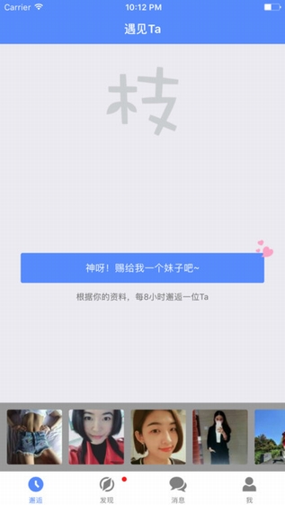 在木枝APP的主页,您可以通过签到获得更多爱心,爱心则能缩短您与下一位TA的邂逅时间。点击“神啊!赐给我一个帅哥吧”这个按钮,您将开启一段奇妙的邂逅旅程。点击后,您将看到一位想要与您聊天的TA,通过回答她(他)的问题,若对方审核您的答案通过,便可展开交流;反之,未通过审核则无法聊天。