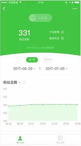 2、支持查询粉丝增长趋势,包括每日粉丝总数以及新增与取消关注人数,并可区分新增粉丝的来源。