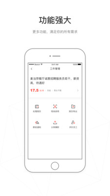商家可一键发布招聘需求,基于独立日庞大的60万条人才库,借助标签化的兼职者,系统将自动匹配最符合要求的兼职人员。迅速实现招募、管理、工资结算及工作评价等需求,尽在一款应用中便可轻松搞定多项人才管理事务。