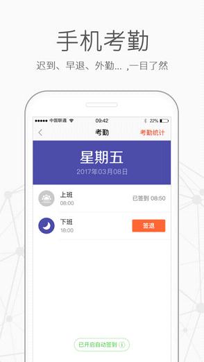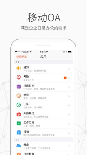 - 移动OA:提供手机考勤、流程审批、工作汇报、移动报销、任务管理、企业云盘、企业通讯录、在线聊天等丰富功能
