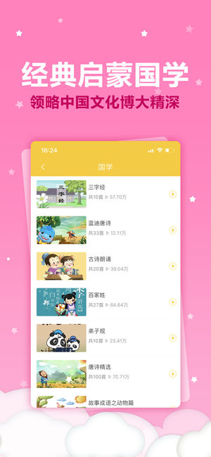 宝宝听故事为小朋友们奉上心仪的儿歌童谣、故事、益智动画、启蒙英语及早教音乐等丰富多彩的内容!软件以孩子的兴趣启蒙为出发点,关注健康、语言、社会、科学、艺术五大领域的幼儿成长,汲取蒙氏教育的精髓,针对性地培养宝宝的感官能力、生活技能、数学思维、语言表达及个性发展。通过儿歌、故事与动画的内容,为孩子们开启语言的大门,启迪智力,激发潜能,助力宝宝快乐健康的成长!