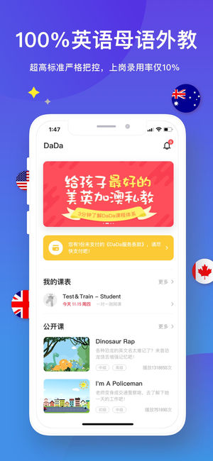DaDa家长端苹果版,让家长与孩子共同在英语的世界中互动。这是一个100%由外籍教师授课的平台,提供丰富多样的课程和一对一的教学体验,欢迎有兴趣的家庭先来体验试听课。
