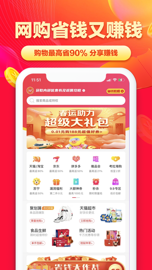 集成天猫//京东//美团/唯品会/饿了么等全网平台的折扣权益于一身,超1000+优质商品,最高可节省90%;