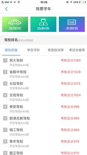 同时,APP还提供了投诉平台,学员在培训过程中若发现驾校或教练存在乱收费、吃拿卡要等违规行为,或对培训服务质量有任何不满,皆可进行;学员对教练及驾校的投诉评价信息亦会汇总并以排名形式呈现。