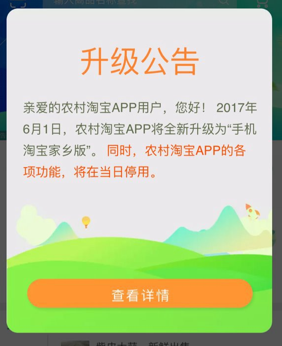 农村淘宝App发布公告,宣告自2017年6月1日起,该平台将全新为“手机淘宝家乡版”,而农村淘宝App的所有功能将不再使用。