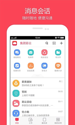 集团彩云是一款集即时通讯、事项收发、日程管理、企业通讯录等多种功能于一身的移动办公协作APP,旨在为企业构建一个高效通畅的工作沟通与管理平台。