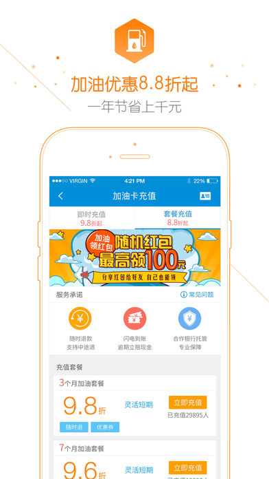 省钱:加油优惠低至8.8折,支持全国中石化和中石油加油站,到账迅速,月均节省100元。