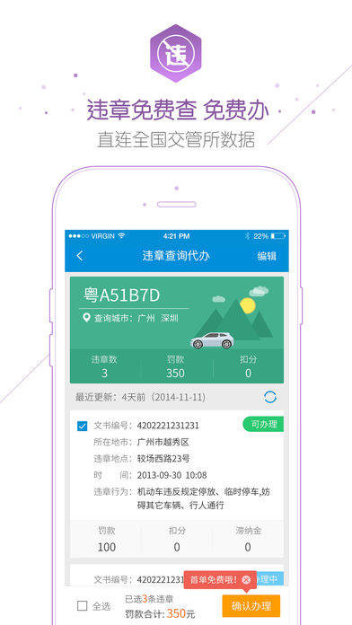 方便:违章办理覆盖全国200多个城市,在线办理立减现金,费用比路边店便宜30%。