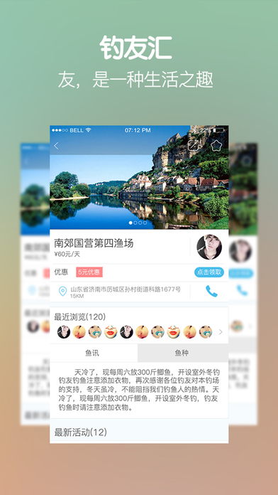 “在钓友圈中浏览钓鱼帖子,大家纷纷分享钓鱼经验,晒出丰硕的渔获,和钓友们自由交流。还能约到附近的钓友,共同享受钓鱼乐趣。”