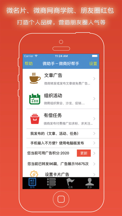 的得力助手——动动手指便可创建微名片,加人,进行免费的微商营销推广。借助微助手,您可迅速分享、召集好友互动,轻松推广朋友圈、微博广告,更能帮助您增加粉丝。没有粉丝,又如何经营微商?微助手将助您一臂之力,快速实现加粉加人之梦。