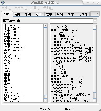 万航单位换算器免费版支持多达30余类单位的转换,包括质量、面积、长度、能量、功、热、功率、体积、密度、加速度、速度、力、压强、角度、传热系数、导热系数、热流密度、运动黏度、扩散系数、黏度、表面张力、焓、潜热、比热容、熵、通用气体常数、立体角、时间、电流、电动势、电阻、电容、电感、磁通量、磁场、体积流量、质量流量、汇率等,覆盖了各个行业的上百种单位名称,用户还可根据自身需求自行扩展,打造个性化的单位和单位组。这将有效提升您的工作效率,具有顶层显示功能,绝对实用!