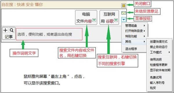 当您关闭搜索窗口后,自在搜软件会隐匿于屏幕左上角,而不会退出,以便检测电脑文件的变化。开机后自动运行时,也会隐藏在左上角。将鼠标移动到屏幕左上角,点击即可显示搜索窗口。同时,您也可以右键点击左上角显示菜单。