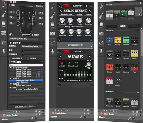 Guitar Pro提供了一个强大而多才多艺的声音引擎,允许你调整每个喜爱的校音中每个元素的重复音色,或与乐器伴奏、音频和母带后期处理结合,创造独特的声音。