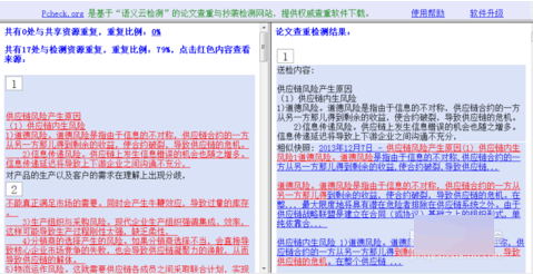 输入检测码后,将弹出新的网页,您可以清晰查看论文的重复率及具体重复位置。