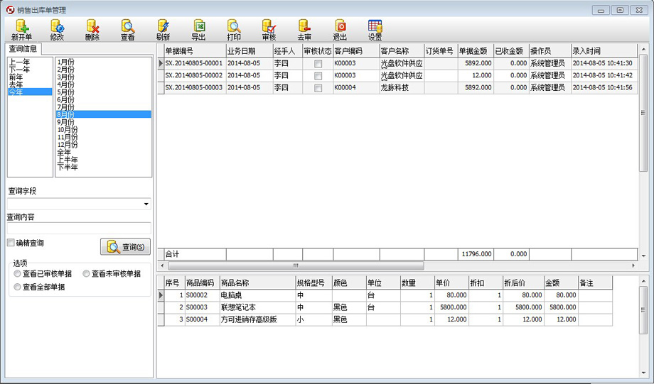 2)便捷地筛选单据信息,如按年、月、日及客户、单号等信息进行查询。